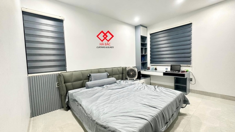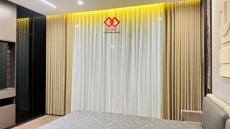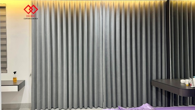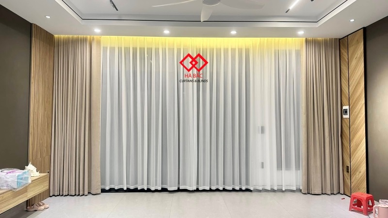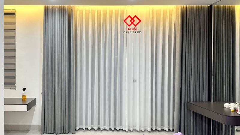 Mẫu rèm vải hai lớp chủ nhà sử dụng là vài Polyester Blackout với hai tone màu ghi xám và màu be . Vải Polyester Blackout là dòng vải mới ra mắt trên thị trường. Dòng vải này có khả năng cản sáng chắn nắng tuyệt đối , ngăn thất thoát nhiệt và làm mát căn phòng . Trước đây khi dòng vải này chưa ra đời để tìm cách ngăn nắng và ngăn nhiệt cho các cửa hướng tây nắng chiếu trực tiếp khách hàng hay tìm đến vải phủ cao su . Tuy nhiên loại vải phủ cao su này có rất nhiều nhược điểm như lên sóng rèm không suôn đều, dễ bị nổ và bong tróc lớp cao su non . Hơn nữa vải phủ cao su không thể giặt và hay bị dính khi trời nồm rất mất thẩm mỹ. Chính vì vậy vải Polyester Blackout ra đời để thay thế cho vải phủ cao su non.